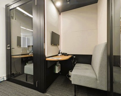 会議スペースには、1人用の会議ブースと複数人で利用できる会議室があります。近年では、社内外の打ち合わせの多くがWeb会議となっており、1人用の会議ブースは静かな環境でオンラインミーティングを行うのに最適です。