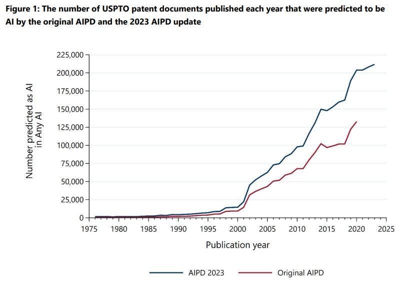 上の図:(註5)元のAIPDおよび2023年更新版AIPDによりAIと判定されたUSPTO特許文献の年間公開件数です。