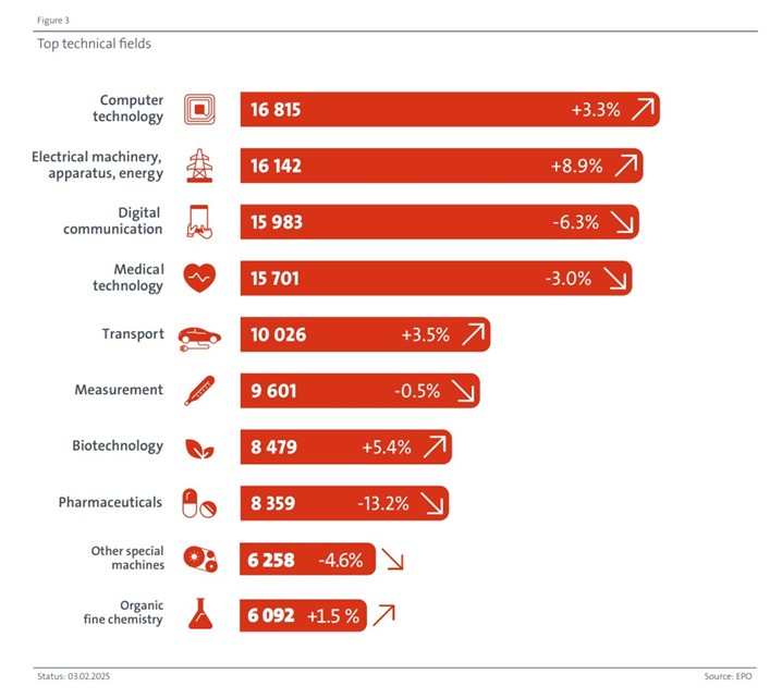 上の図:(註7)2024年に出願件数が最も多かった10の技術分野について、欧州特許庁(EPO)に提出された欧州特許出願件数および前年からの増減を示しています。