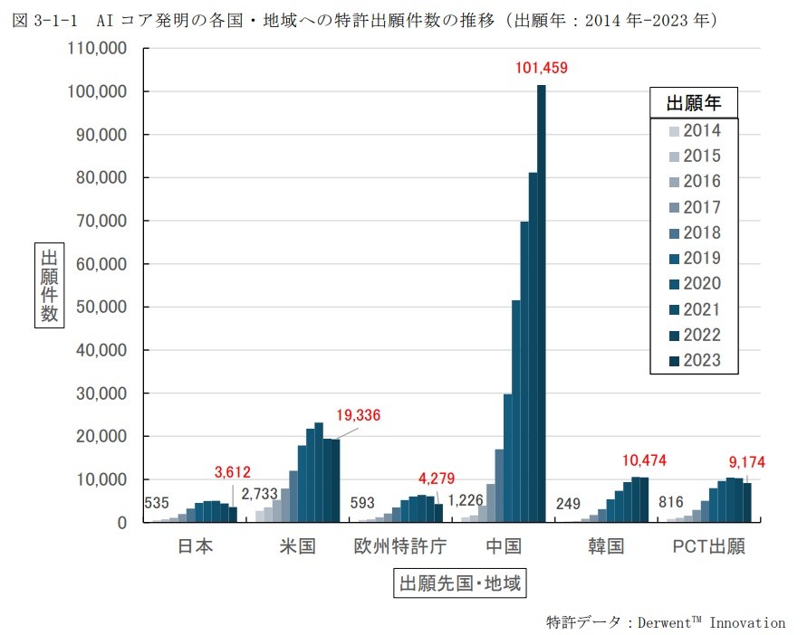 上の図:(註8)2014年から2023年までのAI分野における各国の出願件数の推移を示しています。