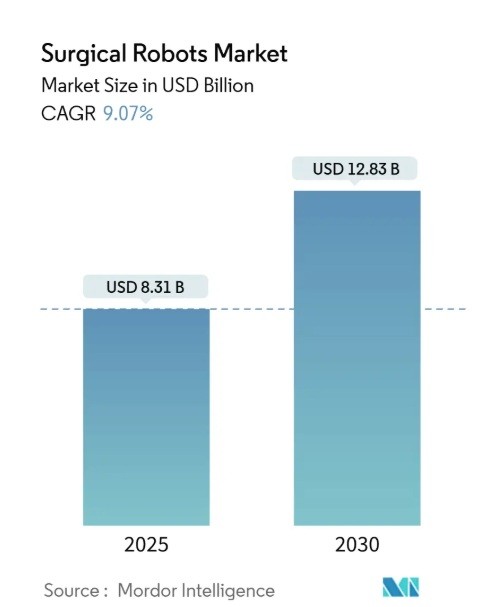 AIが加わることで、従来は熟練医師でなければ難しかった操作を自動補正したり、手術中のデータをリアルタイムで解析して合併症リスクを警告したりすることが可能になります。Mordor Intelligenceの市場調査によれば、手術支援ロボットの世界市場は2025年の83億1,000万米ドルから2030年までに128億3,000万米ドルに拡大すると予測されており(註9)、特にAI搭載システムが成長を牽引するとされています。